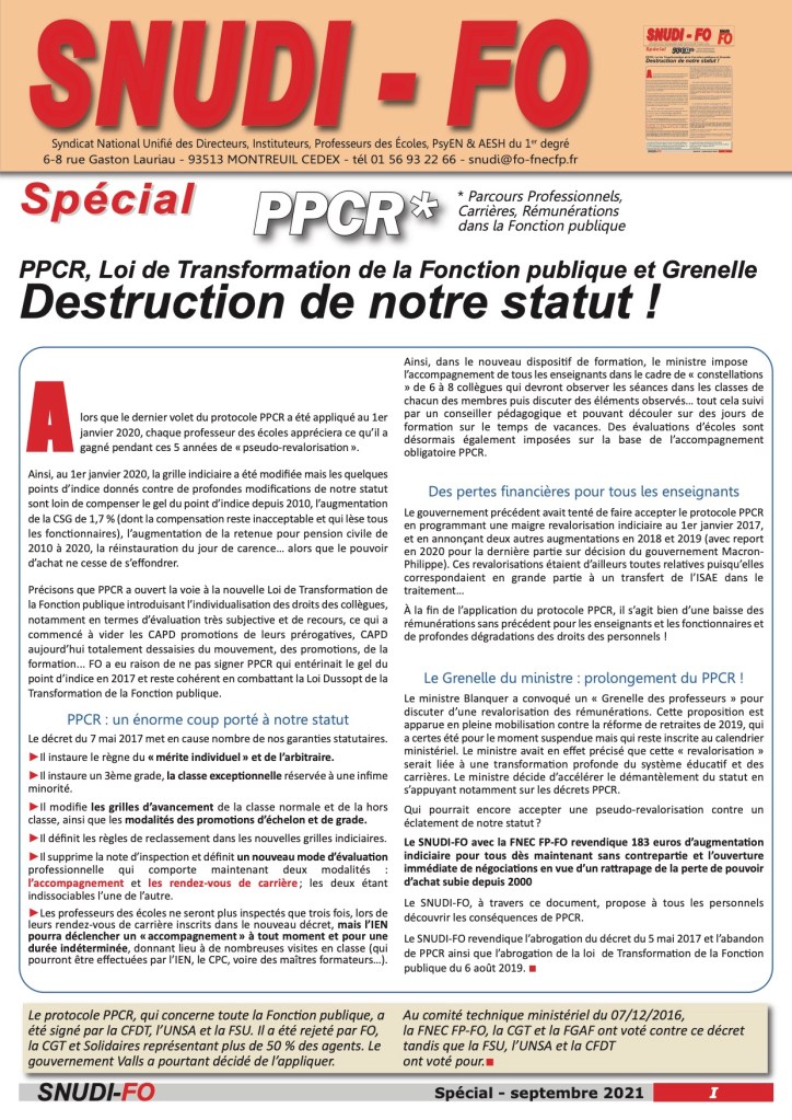 Vous trouverez le dossier du SNUDI-FO concernant le PPCR, à jour de septembre 2021.