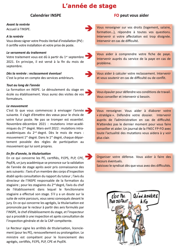 Dans tous les cas, FO vous accompagnera pour défendre votre titularisation (audience, recours…). Tout au long de l’année, en cas de problème (avec les formateurs, les parents, l’équipe pédagogique, vos formateurs à l’INSPE…), n’attendez pas : contactez FO.
