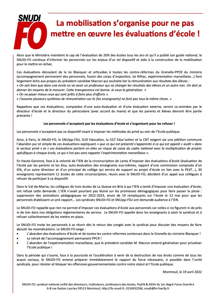 Le SNUDI FO rappelle que rien ne permet d’imposer les évaluations d’école car celles-ci ne figurent ni de près ni de loin dans nos obligations réglementaires de service !