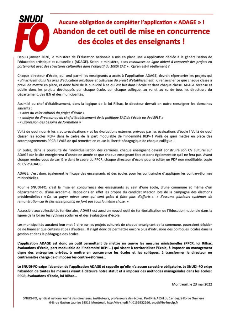 1 juin 2022SNUDI FO 974 « ADAGE » : le SNUDI FO demande l’abandon de cet outil de mise en concurrence des écoles et des enseignants !